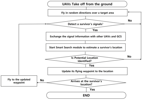 The flowchart in Figure 7 illustrates the overall operation procedure of the proposed system. UAVs take off and fly in random directions until they catch signals from a survivor. Once a radio signal with the survivor’s radio module is detected, the UAV shares and exchanges the information with other UAVs and GCS. When UAVs and/or GCS collect enough information (i.e., beacons), then they launch their own Smart Search modules. The Smart Search module runs the proposed genetic-based localization algorithm to estimate the survivor’s location. If the potential location of a survivor is identified, even though it is not accurate yet, the UAV updates its waypoint for flight. If the UAV arrives at the identified location, it ends its mission and notifies it to GCS. If the survivor is still far from the current UAV’s location, then it flies towards the identified location and keeps collecting beacons. Based on the updated beacons, it re-estimates the potential location of a survivor and updates its waypoint again until it reaches the survivor.