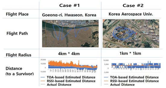 As shown in Figure 8, we performed a flight search test in two real-world test cases to verify the performance of the proposed survivor location tracking system. The first case was based on data obtained with a zigzag-type route from about 4 km × 4 km in Gojeong-ri, Hwaseong of South Korea. The second estimate was based on data obtained with a circling flight route within 1 km of the survivor in the Korea Aerospace University’s flight runway. In these two case fields, we examined features of signal-generation data (RSSI and ToA) obtained by operating drones to the distance and estimated the survivor’s location based on the data.