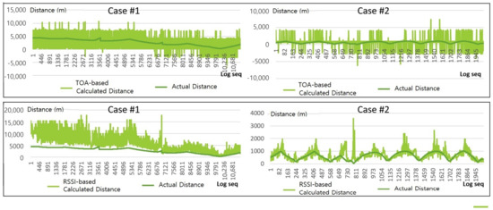 To localize the survivor, we need to accurately estimate the distance to the survivor. In this paper, we calculated the distance between the survivor and drones based on RSSI and ToA of signals. This section analyzes the estimation results tested in Case #1 and Case #2.