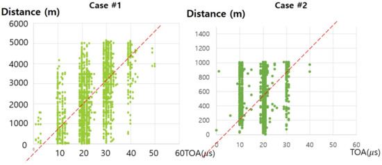 Figure 10 shows a real distance between a drone and a survivor (i.e., y-axis) per each obtained ToA value (i.e., x-axis). Each dot corresponds to each measure. These graphs show that, even if the ToA values are the same, the corresponding values of distances do not converge but varies. This implies that the error of the ToA-based estimated distance would be large regardless of how far a drone is from the survivor. To ameliorate this problem, we used linear regression to obtain the “realistic” value of speed of ToA signals with minimal error in each case field. The value is expressed as a first-order straight line in each graph of Figure 10. Note that, even with the use of linear regression value, ToA-based estimation error would not be negligible. Similarly, in order to minimize the error of the RSSI signal-based distance estimation, this paper determines the value of a variable n in Equation (1) based on the measured data in each test case field.