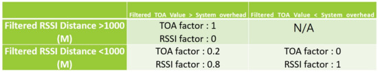 Overall, we observe that errors of RSSI and ToA signals are related to the distance between a drone and a survivor. In particular, we discovered the tendency that RSSI-based distance measure is more accurate than ToA-based measure near a survivor while ToA-based shows better accuracy when a drone is far from a survivor. Thus, to increase the accuracy of the location estimation system, this paper adopts a “hybrid” of RSSI- and ToA-based methods depending on the estimated distance between a drone and a survivor. We separate the estimated distance values into two categories: above and below 1000 m as shown in Figure 11. Basically, if the estimated distance value was more than 1000 m, the RSSI value had a very large error and was difficult to be used as meaningful data. Therefore, distance estimates were made based on the filtered ToA values only when the distance is more than 1000 m. On the other hand, if the estimated distance is less than 1000 m, we increase the RSS reflection ratio gradually because we observe that the error of the RSSI value is reduced near a survivor. Note that we also exclude abnormal ToA-based signals from distance estimation procedure when the filtered ToA value is smaller than system overhead.