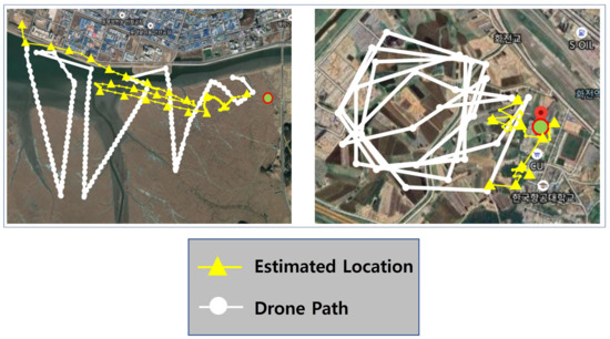 For the second case shown in the right picture of Figure 13, a drone takes off in the center of the picture and flies in a circle. A survivor is located in the right part of a picture as shown in a red dot. The initially estimated position is at the right bottom of a picture which is obviously not an accurate location. However, as the circulation flight progressed, it was confirmed that the sequence of estimated positions is getting closer to the actual position of the survivor. In this example flight, the final estimation is about 80 m away from the actual survivor’s location.