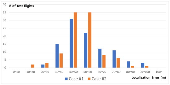 Just like the above two example flights, we tested the proposed Smart Search Program 100 times in Figure 14. These results show that, in most cases, localization error was about 40∼50 m. Note that the target area is very large about 4 km × 4 km in Case #1 and 1 km × 1 km Case #2, and we are using a high-speed fixed-wing plane, not a slow quad-copter. Since a fixed-wing plane cannot stop in the same position and it just has to hover in a large circle, we think the accuracy of estimation is limited in our study. To compensate for these limitations, it can be used not only with high-speed fixed-wing drones, but also with low-speed fixed-wing drones such as quad-copters. Once the location of the survivor is tracked in a small range, a more accurate location can be estimated using a low-speed fixed-wing drone.