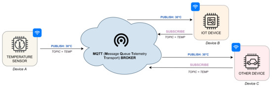 This new communication paradigm, where each device can communicate with another one, is simplified in Figure 2, which shows how it is possible to exchange information between geographically distant devices using the Message Queue Telemetry Transport (MQTT) protocol. In more detail, this process is performed by using two operations, publish and subscript. First, through the MQTT protocol, a device publishes data on a server (conventionally called Broker). Then, other devices can receive the data by subscribing to a topic (a channel mechanism that allows us selective intercommunication between devices) where they are stored.