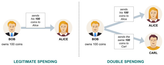 Double Spending. The main peculiarity of the blockchain is that it can guarantee (or strongly limit), in a decentralized manner, the presence of double spendings. These issues arise from the absence of a central intermediary in the decentralized context of the blockchain. Roughly, let us assume that an entity Bob owns 100 and binds them in a transaction to pay another entity Alice for a certain service/good. A double spending occurs if Bob, illegitimately, binds the same 100 in a second transaction, to pay another entity (e.g., Carl) for a different service/good. Since there is no central intermediary (e.g., a bank), it may be challenging to determine that one of the two transactions was invalid. This problem, graphically summarized in Figure 3, has been faced by adopting a distributed timestamp mechanism to determine which transactions should be accepted and rejected. More specifically, common blockchain technologies (like, for example, Bitcoin) exploits a hash-chain approach to address this task [11]. To clarify this point, suppose that a block stores the transaction from Bob to Alice and a subsequent block stores the transaction from Bob to Carl: through the hash-chain mechanism, each participant can verify that is older than and thus reject the double spending transaction from Bob to Carl.