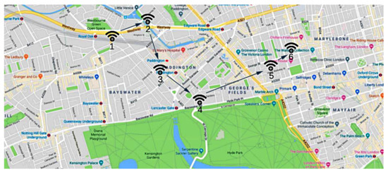 The mobile (or cellular) environment is a radio network distributed over land areas (defined cells), where each cell is served by at least one base station (i.e., a fixed-location transceiver) [4]. This configuration divides the radio network into overlapping geographic areas, producing a mesh of hexagonal cells served by a base station () placed in the center of the area. The cell overlapping grants a continuous radio coverage of the connected mobile devices since each base station operates like an hub, retransmitting a mobile device’s radio signal to another mobile device, and adopting different frequencies to avoid interferences. Moreover, the base stations grant the connection between mobile devices when they move between cells.