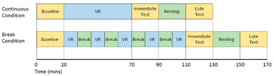 Study design for both the continuous and the break condition completed on different days. VR denotes time exposed to the VR game.