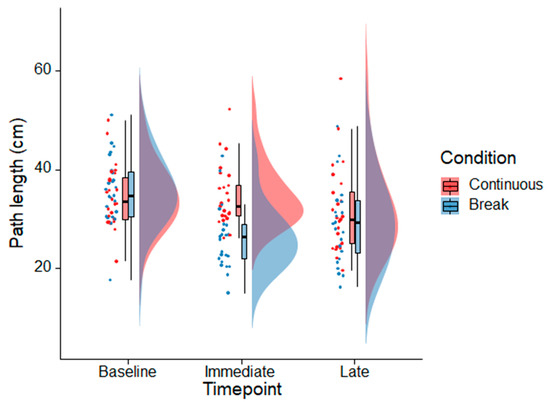 Raincloud plots [29] showing the distributions of the path length data for the continuous and break VR conditions before VR exposure (baseline), immediately after a total of 50 min of VR, and 40 min after the last VR exposure (late timepoint). The dots show individual data observations. The boxplots indicate the conditions’ median, upper and lower quartiles, as well as the distance of 1.5× the interquartile range from the upper and lower quartiles, respectively (whiskers). The half violin plots display a probability density function of the data see [29] for more information.