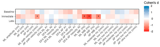 For the break condition (Figure 4b), five variables had statistically significant (p < 0.05) effect size values > 0.83 between the Baseline and Immediate timepoint assessment; ML path velocity (Cohen’s d = 1.15, p < 0.001), ML MIF (Cohen’s d = 1.49, p < 0.001), ML MIB (Cohen’s d = 2.15, p < 0.001), AP MIF (Cohen’s d = 0.85, p < 0.004), AP MIB (Cohen’s d = 1.88, p < 0.001). Four of these five variables were also statistically significantly different from the baseline measures at the late timepoint. However, the magnitude was attenuated for all five, with only ML MIB (Cohen’s d = 1.10, p < 0.001) and AP MIB (Cohen’s d = 1.27, p < 0.001) having effect sizes larger than 0.83.