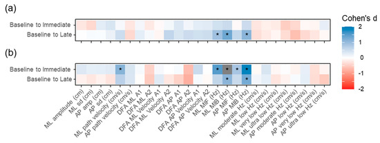 Heatmaps indicating the Cohen’s d for differences between baseline and later measures for (a) the continuous VR and (b) the break condition. * indicates an effect size smaller than −0.83 or larger than 0.83. ML: medial–lateral; AP: anterior–posterior; DFA: detrended fluctuation analysis; MIF: mean instantaneous frequency; MIB: mean instantaneous bandwidth.