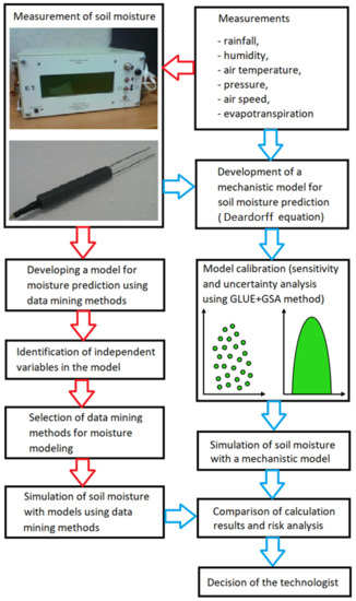 The analyses involved an algorithm for the selection of the soil moisture content forecast model. Two mathematical models were taken into consideration: a statistical one and a physical model by Deardorff [6,22] which was especially developed and dedicated for shallow soil layers moisture, shaped by daily weather variations. The comparison of the models is a base for their further exploitation in the field of water resources management and related decision-making. The sense of comparative studies and resultant model selection would facilitate to approach either water shortages or excess (i.e., drought or flood), and to mitigate environmental and ecological threats (not overlooking economic issues). With reference to the above-mentioned problems, an appropriate scheme was proposed (Figure 1).