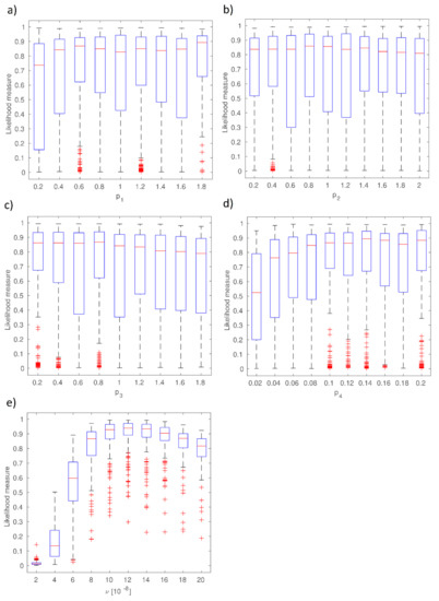 A priori distribution reflects initial assumptions on parameters’ variability. In the case of models of surface runoff either soil moisture content or the structure of the parameters’ distribution is not known, but only their range or allowable limits resulting from their physical interpretation. A constant character of the parameter distribution was adopted for soil moisture content modeling herein, which is a frequent case in such or similar applications [38]. Moreover, GLUE parameter identification embraced the transformation of a priori distribution to a posteriori one through reliability function as conditioning the probability of parameter combination due to the fitting quality of the modeled and measured values. In the analyses herein the following form of the reliability function was applied: