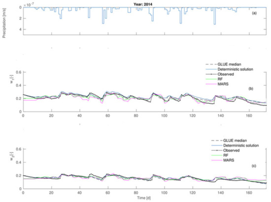 Taking into consideration the simulation results by statistical models on one hand, and the physical model results on the other hand, additional calculations of soil moisture content (w1, w2) were realized for vegetation seasons of 2013 and 2014 (calibration stages). This aimed to provide some insight into the models’ performance in slightly different development of hydrological and meteorological conditions (e.g., temporarily variable precipitation seasons). The achieved results, given in Figure 7, Figure 8, Figure 9 and Figure 10, prove that from all the applied methods (Deardorff model, BT, RF, MLP, SVM and MARS method) the best match of the modeled and the observed soil moisture contents was provided by Deardorff equation (physical one, Equations (4) and (5)). For most of the analyzed periods, the outcome of all applied models shows the overestimation of the simulated values in comparison to measurement data. This fact can be treated as a limitation in respect of the utilization of these models for soil moisture control. In realistic exploitation conditions, the soil moisture content would be lower than the mode result, which can lead to water shortages at the stage of decision making.