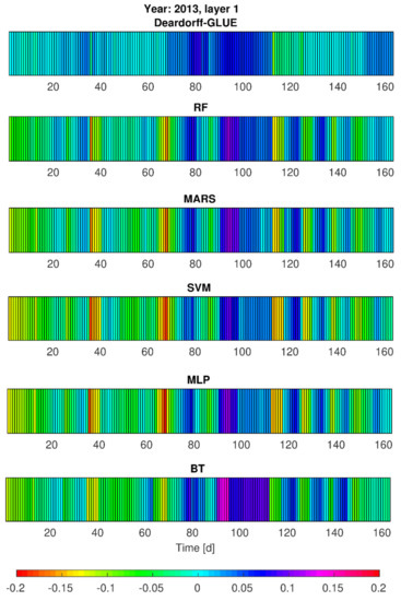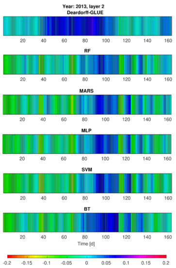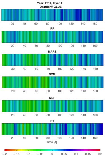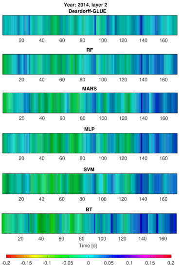 Based on the performed calculations by statistical models (RF, BT, SVM, MLP, MARS), and also by the Deardorff model, it was found that soil moisture contents (w1, w2) for no-rain periods were overestimated by 10% (SVM, MLP) or even by 15% (BT, RF, MARS, Figure 7 and Figure 8). The same tendency was revealed for 2014 in the second part of the analyzed period—mainly in September. The highest error values, exceeding 5%, were noticed for the BT method. Relatively small errors of w1 and w2 forecast were achieved by RF, BT, SVM, MLP, and MARS determined by the choice of independent variables. It was also noticeable that the simulated soil moisture content at the depth of 0.10 m (w1) in the case of intense precipitation (period between 30th and approximately 90th day) was locally lowered even by 20% (Figure 8) by the applied statistical models: MLP, SVM, MARS, and RF.