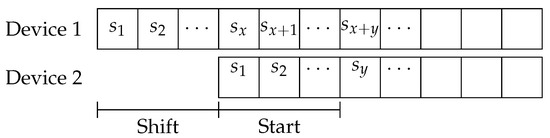 where is a function representing the number of coincidences that the protocol has in a single phase, given a shift of s slots between the two devices, this function needs to be computed by analyzing the behavior of the evaluated protocol. It will be detailed later for each considered protocol as an illustration. Figure 4 shows an example of function for a symmetric protocol, where the length of ℓ is 16; therefore, the same sequence will be repeated after 16 slots. The active slots are 1, 2, 4, 7, 11, and 16. This figure shows a shift of 6 slots between the starting time of the two devices, so it is used to compute . For that particular shift, the deterministic protocol will have exactly two coincidences located at slots 1 and 11.