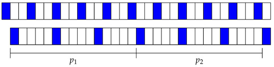 Disco [8] is based on the Chinese Remainder Theorem and uses prime numbers to ensure slot coincidence between devices. It introduces the idea of using relative prime numbers as the number of slots in a frame for a given device. Device d will have a frame of size . Then, each device activates the first slot of the frame, that is, in slots 0, , , and so forth. An example of Disco slot structure for one device is shown in Figure 5 for . Active slots are always located at the beginning of each frame and are colored in blue.