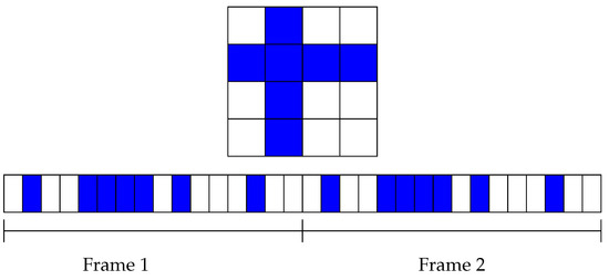 There are many algorithms based on Quorum techniques. In the one presented in [22], the algorithm uses an matrix as the frame structure. Then, one row and one column from that matrix are chosen for active slots, which ensures that two devices will have at least two coincidences upon a frame even if both devices selected different rows and different columns. Figure 6 shows an example of a 16-slot frame for one device. The upper part shows a matrix representation where the second row and column are selected. The active slots are blue, whereas the inactive slots are white. The bottom of the figure shows the same choice of row and column but is represented as continuous slots over time.