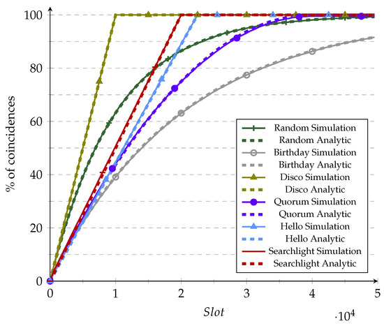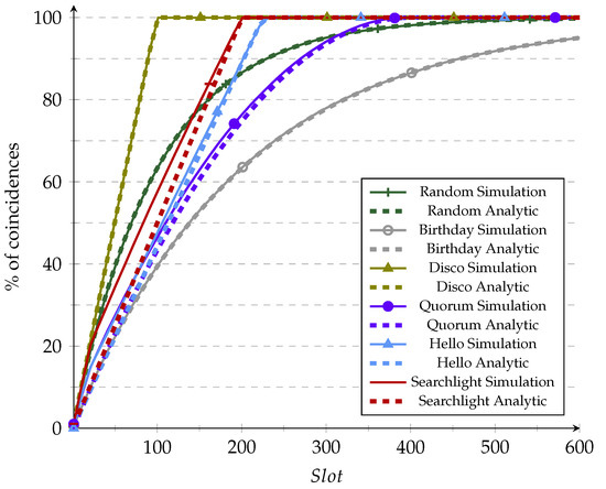 This section validates the proposed framework using simulations developed in Python. For this, we implemented the behavior of each protocol according to their specifications, adding the probability of success . Each protocol was simulated 100k times using a different seed for each experiment. The seed changed random numbers, shifts, and the start of each simulation for each protocol. A coincidence occurs when the protocol dictates that both devices are active during the same slot and a uniform randomly generated number for each of the two devices. The simulation parameters for each protocol for 10% and 1% duty cycle are shown in Table 2. Those parameters are selected to accomplish the required duty cycle as close as possible.