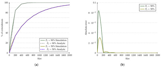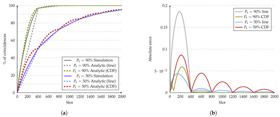 The model proposed in Section 3 was validated via simulations for each protocol. We present comparisons between analytic and simulation plots and the error between both to characterize the discrepancies. Simulations were run 100k times to maximize the convergence of the protocol and decrease the error due to simulations. Each of the simulations uses a randomly generated shift and start to comply with CDF definitions. There are two devices in each simulation, and we plotted the protocol’s analytical CDF, simulations, and the error between both.