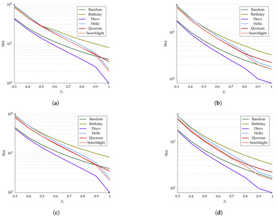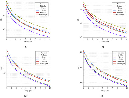 Figure 16a shows that most protocols reached 98% of coincidences simultaneously, but Disco and Birthday were always the best and worst protocols, respectively. On the other hand, in Figure 16b, there is a more significant difference for 80% of discoveries between Random, Hello, Quorum and Searchlight. In this plot, Disco and Birthday are also the best and the worst, respectively. When evaluated at , Figure 16c,d indicate that Birthday, Hello, Quorum and Searchlight have similar behaviors. However, Random and Disco differ from the rest of the protocols and have the best performance for both 98% and 80% of discoveries. It is worth noting that for , Birthday’s performance was very similar to that of Quorum, Searchlight, and Hello.