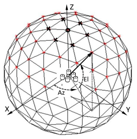 Let us consider a 2D RSA with a 2D-angle-grid defined as in Figure 1. The 2D-angle-grid is defined by the icosphere structure [46], which is formed by subdividing the triangles of a regular icosahedron, and the number of subdivisions (W) determines the density of the vertices on the surface of an icosphere [47]. The line between the origin and one of the vertices defines an AoA direction and is represented by azimuth (Az) and elevation (El) angles. The mesh’s angular resolution level can be determined by averaging El-angle differences between the vertex on the z-axis (marked by a circle) and surrounding 6 vertices (marked by cross). For example, the resolution is 0.54 degrees, when W is equal to 7, and there are total of 29,495 vertices that are close to evenly distributed on 4π solid angle. Suppose the array FOV is defined within [ and it is discretized into a 2D-angle-grid in front of the RSA. For example, the red vertices in Figure 1 are inside the array FOV.