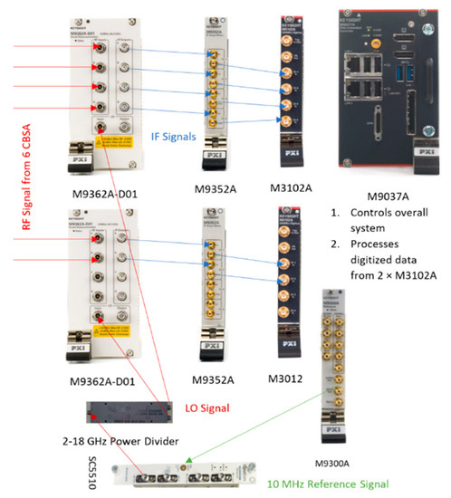 The PXIe based 8-channel microwave receiver hardware assembled in an 18-slot Keysight PXIe M9019A Gen-3 chassis is shown in Figure 3. Six of the eight channels were connected to the CBSA array to form the RESM receiver. The PXIe modules used in the receiver are listed in Table 2, with their slot locations in the chassis. The first five modules were from Keysight Technologies, Inc., and the last module was from SignalCore. The signal flow from RF to IF, and then sampling and processing are shown in Figure 4.