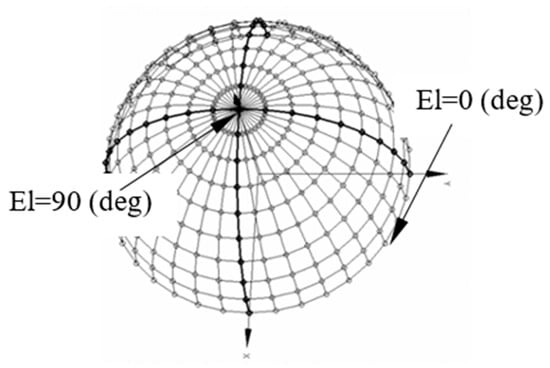 Thus, there were a total of 13 and 7 angles measured for Az and El, respectively, i.e., at each frequency, there were 91 directions. During the measurement, since the positioner was an azimuth-on-elevation system, we set an El-angle first and then rotated the Az-angle. At each Az-angle, the frequency was scanned from 2 to 18 (GHz) at 1 (GHz) interval. The Az- and El-angles define the directions in the UV-sphere, as illustrated in Figure 6.
