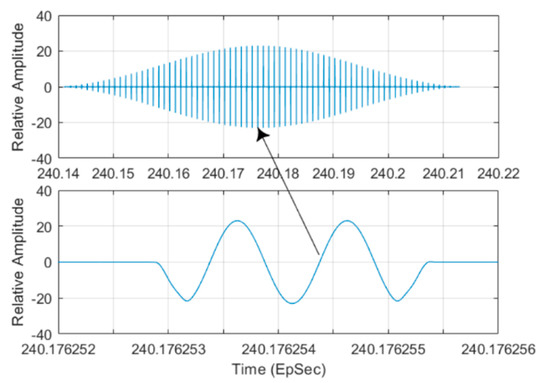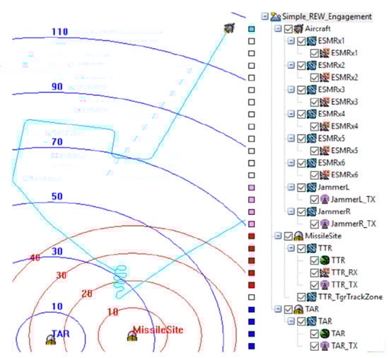 Figure 7 shows the top view of a REW engagement scenario. An aircraft installed with a multi-channel RESM sensor (ESMRxi (i = 1 to 6)) and a jammer system was approaching an area defended by an RF guided missile system, which was modeled by TAR and MissileSite. The cyan-line shows the aircraft flight path projected on the ground. In the figure, the aircraft icon was located at the beginning of the scenario. The vignette of the scenario to be used to demonstrate the multi-channel CS-based AoA measurement system was that the RESM receiver intercepts the TAR signal whenever the RESM receiving antennas intercept the TAR signal during the flight, the signal’s AoA is measured by the RESM system. The constraints that define the RESM receiver can intercept the TAR signal will be discussed later.