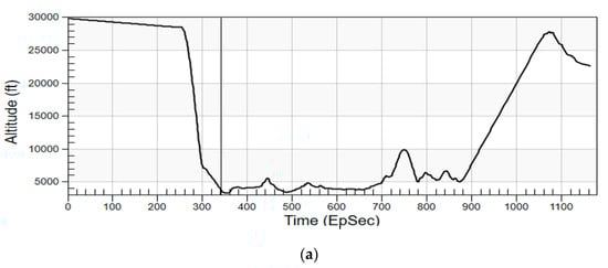 (a) Altitude of the aircraft in the scenario, (b) cyan drop-lines indicates the aircraft from terrain surface at different times (EpSec: Epoch Second).