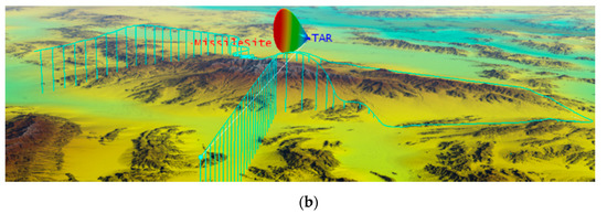 The aircraft altitude in the scenario is plotted in Figure 8a. The vertical cyan lines in Figure 8b show the distances between the aircraft and terrain surface at different moments. One can see that after the onboard RESM detects and measures TAR signal, the aircraft dramatically reduces its altitude and flies in between mountains. The dynamically changing aircraft flight trajectory and attitude form the first constraint in the RF HF-M&S. The RESM receiving antennas can only intercept the TAR signal when the line-of-sight (LOS) condition is met.