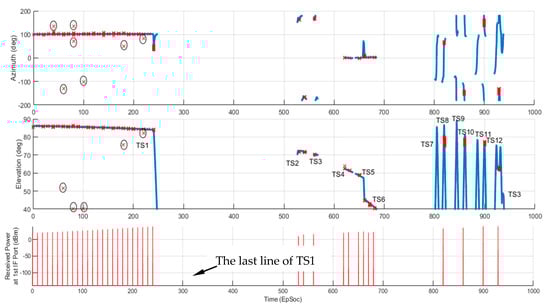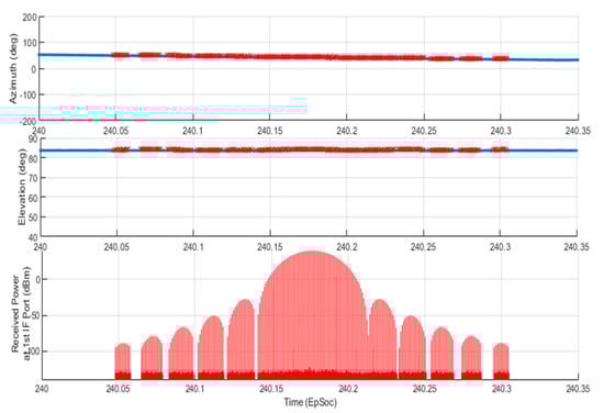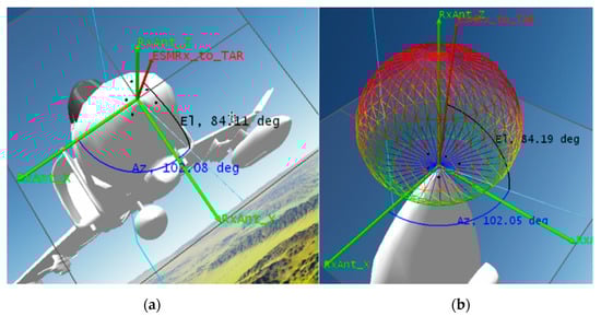 Figure 9a shows the 6-element RESM receiving array installed at the nose of the aircraft. The origin of the array local coordinate system was located at the phase center of the first element, and other element phase center locations were indicated by the black dots in the figure, and Table 1 gives their coordinates. Figure 9 also shows the current direction from the array to the TAR by the red vector called ESMRX_to_TAR. This vector was defined by Az and El angles in blue and black lines, respectively, in the array’s local coordinate system RxAnt_(x, y, z). The center element radiation pattern is shown in Figure 9b, which has about 100 (deg) 3-dB tbeamwidth the at S-band. Other elements have the same antenna pattern and are not shown in the figure. The second constraint used in the M&S was that the CS-based AoA algorithm only processes signals within the antenna’s 3-dB beamwidth. Using this constraint together with LOS constraint discussed earlier, STK generates the time slots (TS) of RESM antenna accessing the TAR signal as listed in Table 3.