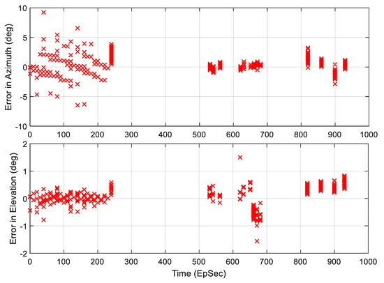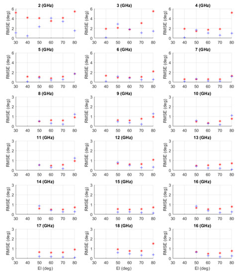 Note that, since the 6 CBSAs were not phase-matched elements and the RF receivers were not identical, at each frequency, the 13 measured data at (deg) were used as the calibration data to remove the amplitude and phase discrepancies caused by the CBSAs and RF digital receivers. Therefore, at each frequency measurement point, the data sent to CS-based AoA algorithm was . The frequency used to estimate AoA is , in which was receiver local oscillator frequency. As mentioned earlier, this is one of the advantages of the CS-based AoA method that it does not need to know the intercepted signal frequency, and the frequency used for AoA calculations was measured by the receiver itself. Hence, the method can be used in an ultra-wide frequency band. The operational frequency band was determined by the antenna elements and receiver hardware.