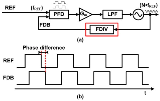 The most common frequency synthesizer for these applications is the PLL. A basic block diagram of the classical charging pump PLL (CPLL) is shown in Figure 1a, where the frequency of the VCO output signal varies with the change in the dividing ratio (N) along the feedback path. Since the feedback signal (FDB) of the frequency divider (FDIV) must have the same frequency as the input reference signal (REF), the frequency of the VCO output signal is N∙fREF, where fREF represents the frequency of the input reference signal.