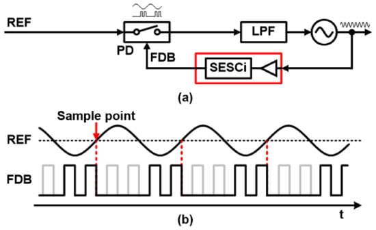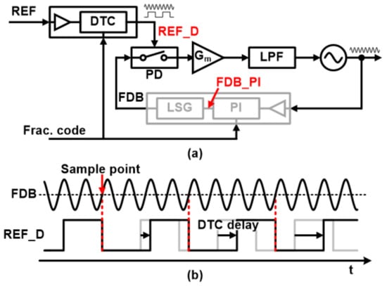 The basic block diagram of SSPLL is shown in Figure 2a. The sub-sampling PLL uses a phase detector (PD) that sub-samples the high-frequency VCO output with a relatively slow REF signal. The PLL structure can improve the in-band noise characteristics by removing the divider. On top of these noise improvements, fractional-N operations based on digital-time converters (DTC) have been proposed to achieve fine frequency resolution [,,,,].