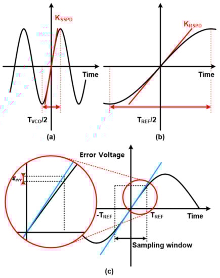 where 𝜙err,SSPD and 𝜙err,RSPD represents the phase error of sub-sampling PD (SSPD) and reference-sampling PD (RSPD), respectively []. TVCO and TREF are periods of VCO and reference signals, respectively. Once we compare Equations (1) and (2), the phase error of the RSPD is much more insensitive to εerr from the fact that there is no coefficient N in the phase error ().