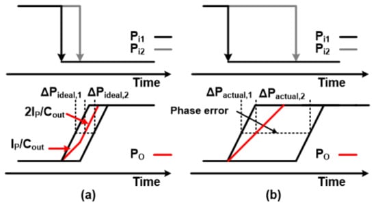 The operation of the conventional unit PI with two inputs Pi1 and Pi2 is as follows: (Assume Pi1 is a fast phase signal) (1) When Pi1 changes from high to low, the corresponding M1 turns on and M3 and M4 turn off. (2) Current IP flows through the M1 transistor to Cout and the output is charged with the slew rate of IP/Cout. (3) Meanwhile, when Pi2 is switched from high to low, the M2 transistor becomes transparent, and the slew rate of the output node doubles (2IP/Cout). These processes are illustrated in Figure 8a. Similarly, reverse operation occurs when Pi1 and Pi2 change from low to high, eventually discharging the output capacitor Cout to the ground. The conventional PI unit can generate intermediate phases in most cases if the phase difference between the two inputs is not too large, but turning on only one of the NMOS transistors (M3 or M4) in the middle of operation causes short circuit problems. To avoid this, a circuit technique with a logic AND gate to control the NMOS transistor is proposed in [], which is shown in Figure 7b. However, if two PI inputs are not close enough, the output signal can be generated with an inappropriate phase. As shown in Figure 8b, if the second PI input signal is too far from the previous signal, the output signal reaches the maximum voltage level before the second input changes. Though this issue can be resolved by reducing the slew rate (IP/Cout), increasing capacitance is not a good idea because capacitors occupy large areas and may need to increase current to maintain a slew rate under normal circumstances.
