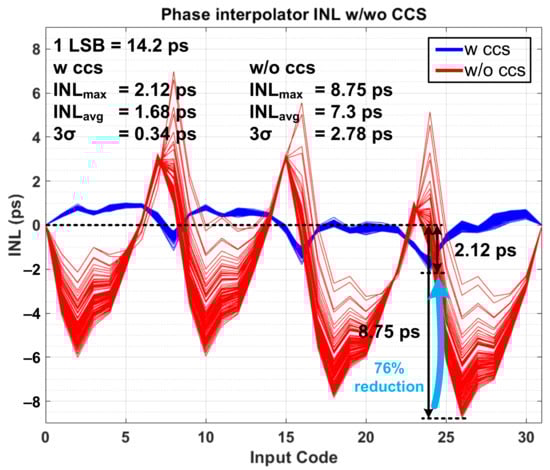To improve the performance of unit PI, we propose constant charge scheme on internal nodes (Xi, Yi). To explain how it works and what has changed from the conventional PI, it would be better to illustrate how a problematic situation occurs when two PI inputs are not close enough. The problem happens by following the next steps: (1) Initially, when both inputs (Pi1 and Pi2) are high, M1 and M2 transistors remain turned off, so charges accumulate on parasitic capacitors of nodes X1 and X2. Therefore, the voltages of X1 and X2 rise close to the supply voltage levels. (2) When Pi1 is changed to low, M1 is turned on and the charge of X1 immediately moves to the load capacitor at the output which incurs a large current flow. Therefore, the voltage of the output node changes suddenly at the beginning of the PI operation, and the situation gets worse if the second PI input does not arrive within the appropriate time frame. This causes a phase error in the PI output. Additionally, the same problem can occur with M3 and M4 transistors. To avoid this issue, it is necessary to prevent charging or discharging the source node of each transistor. This means that the source voltage of each transistor should be prepared so that the output voltage does not show a sudden increase/decrease in voltage when the first PI input is received. To this end, constant charge circuits were added to both sides of the unit PI in Figure 7b, making Figure 9. The constant charge circuit then generates a current path to prevent node voltage from charging or discharging. The proposed circuit technique prevents large instantaneous current flows, which leads to improved phase error during normal PI operation. Figure 10 shows the results of post-layout Monte Carlo simulations of 5-bit pipelined PI, especially INL values for all possible input combinations with/without constant charge circuits. The INL values improved by 76% in the worst case as indicated, where the INL values without the constant charge scheme turned out to be 8.75 ps in the worst case and 7.3 ps on average and 2.78 ps in the 3-sigma value, while the INL values in the proposed circuit technique were 2.12 ps in the worst case, 1.68 ps on average and 3-sigma value was 0.34 ps. For reference, the 1 LSB value of 5-bit PI at 2.2 GHz frequency is 14.2 ps. In general, the quantization error of sensitive circuits should be less than 0.5 LSB, which is about 7 ps in the current situation.