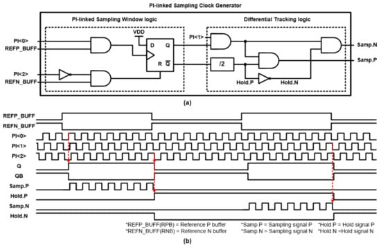 The schematic diagram of the proposed PSCG unit is shown in Figure 11a. The PSCG unit consists of two building blocks, the PI-linked sampling window logic that creates a sampling window for fractional operations and the differential tracking logic. For simple designs, only a few logic gates and resettable DFFs (D flip-flops) were used for both units. The operation of each unit will be followed by where the expected waveforms are depicted in Figure 11b.