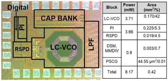 The proposed RSFPLL prototype was fabricated with a 65 nm CMOS process with a core area of 0.42 mm2. Figure 15 shows a die photo of the proposed RSFPLL (left) and a power and area analysis table (right). Note that the core idea of fractional-N operation lies in the PSCG unit, which accounts for only 0.01% of the total area. The total power consumption of the proposed RSFPLL is 8.17 mW. The power breakdown analysis shows that most of the power consumption happens from LC-VCO (42%) and PI/RSPD analog blocks (9.8%), which is understandable. Noticeably, the digital block (DSM, MMDIV, and PSCG) only consumes 0.8 mW (0.7%) of power. This confirms that the proposed fractional-N operation for the RSPLL based on PSCG techniques is area and energy efficient.