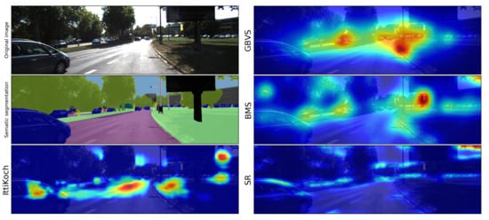Deng et al. [] evaluated the use of different state-of-the-art bottom-up saliency models for traffic saliency detection. The experimental results obtained from the comparison of the predicted saliency and human gaze data indicate that bottom-up saliency models cannot be directly applied to predict the drivers’ allocation of visual attention. They show that this limitation can be resolved by adding a top-down control to modulate the bottom-up prediction.