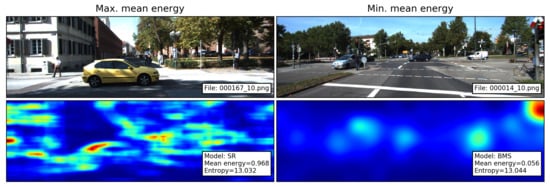 As energy feature, we take the mean of over all pixels of the image []. Following the interpretation of Perrin et al., high mean energy indicates that the saliency map contains several salient regions or shape-wise complex areas of interest, whereas low energy indicates more simple-shaped salient regions []. To illustrate this interpretation, the saliency maps with the maximum and minimum mean energy are shown in Figure 2.
