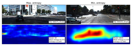such that and . Entropy has been used as feature for the evaluation of images and saliency maps [,], where larger entropy values indicate the presence of a complicated texture or structure [,]. Following the interpretation of Perrin et al. [], a high value of entropy indicates that the saliency map contains a lot of information (i.e., “it is likely that saliency is complex”) and a low entropy value indicates a single zone of salience. This interpretation is illustrated with the saliency maps with the maximum and minimum entropy in Figure 3.