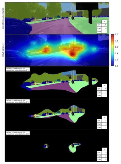 To account for cases in which an object instance is partially within the salient area, the object instance is regarded as salient if . Thus, as the saliency threshold increases, fewer object instances are salient. An example of the number of salient instances for different saliency thresholds is shown in Figure 4.