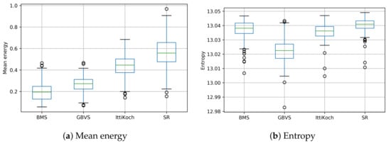The distribution of the mean energy values obtained with the selected models is shown in Figure 5a. There are significant differences in the mean energy of the saliency maps computed with different models under a repeated measures ANOVA test [] , . A post-hoc Tukey test [] (see Table 1) revealed that all the pairwise differences are significant (). These results indicate that the number of salient regions and their shape complexity differ across models (cf. Figure 1). Although BMS produces more simple-shaped salient areas, SR produces a larger number of complex-shaped salient areas (cf. Figure 2).