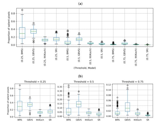 The proportion of salient pixels over different thresholds and saliency models is shown in Figure 7. There are significant differences under a Friedman test: , . The results obtained with a post-hoc Nemenyi pairwise test for the combinations of threshold and model are shown in Table 4. Note that cross-threshold pairs lack of practical meaning. Therefore, they are not interpreted in the analysis. We encounter significant differences (), except for the following pairs: BMS-GBVS and IttiKoch-SR in the 0.25 threshold, BMS-IttiKoch in the 0.5 threshold, and BMS-IttiKoch in the 0.75 threshold. These results indicate that for the 0.5 and 0.75 thresholds the SR and GBVS models produce the smallest and largest proportion of salient pixels, respectively. Based on these results, it is expected that the number of objects within the salient areas differs across the models. Therefore, in the following section, we perform a thresholding analysis to determine the extent to which object instances are contained within the salient areas of an image.