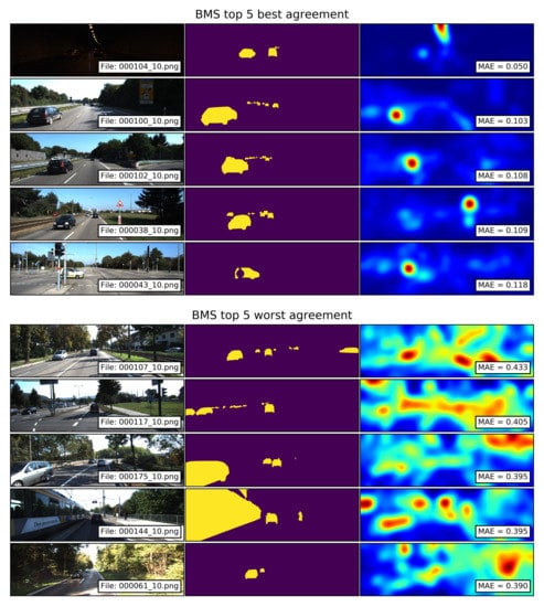 The top 5 best and worst agreements between the segments of traffic participants and the saliency maps computed with the BMS model are shown in Figure 8. The saliency maps with the best agreements show that while smaller traffic participants in the background fall within a uniform salient area, the mid-size vehicles in the foreground generate high-saliency blobs. The simple-shaped high-saliency areas can be attributed to the closed contours of the vehicles. It is important to note that even in the pictures with small MAE values, elements such as lights (image 000104_10.png ) and traffic signs (images 000038_10.png and 000043_10.png) generate areas of higher salience compared to the ones located over the traffic participants.
