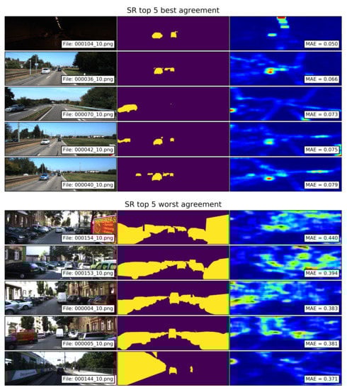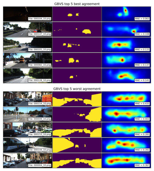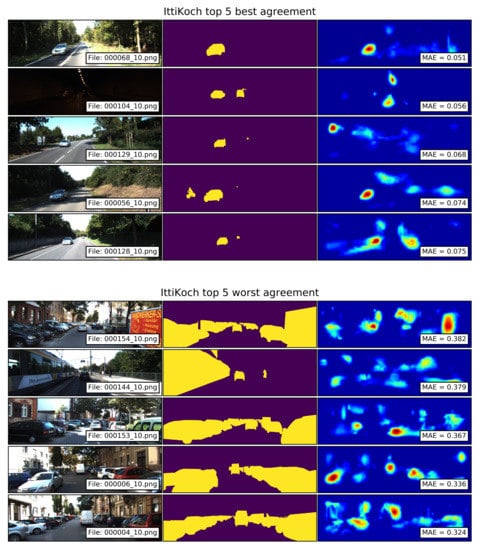 The top 5 best and worst agreements between the segments of traffic participants and the saliency maps computed with the IttiKoch model are shown in Figure 10. The saliency maps with the best agreements show that images with mid-sized traffic participants which locally stand out from their surroundings produce small MAE values. The saliency maps with the worst agreements show that as in the case of GBVS, large segments of traffic participants located at the extreme sides of the image fall out of the salient areas resulting in large MAE values. In this case, the center–surround contrast operation highlights only small portions of the vehicles, which results in separated salient areas.