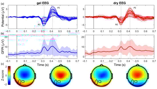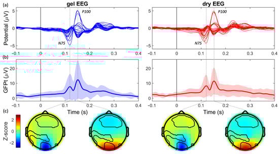 Pattern-reversal visual evoked potential (VEP) evoked by the checkerboard paradigm, for the gel EEG system (blue; left) and dry EEG system (red; right). (a) The average VEP (μV) per channel over subjects. (b) The global field power over time (GFPt; μV) averaged over subjects. Shaded areas indicate the confidence interval (mean ± 2x standard deviation). (c) The standardized topographic distribution (Z-score) of the two main components of the VEP. Black lines encircle the pixels that were significantly different between the two systems.