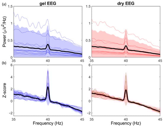 Power spectral density (PSD) of the 40 Hz Auditory steady-state response (ASSR) for the gel EEG system (blue; left) and dry EEG system (red; right). (a) Absolute PSD of the 40 Hz-ASSR (μV2/Hz), averaged over channels per subject. (b) Standardized PSD of the 40 Hz-ASSR (Z-score), averaged over channels per subject. Black lines indicate average PSD over all subjects and channels; shaded areas indicate the confidence interval (mean ± 2xSD).