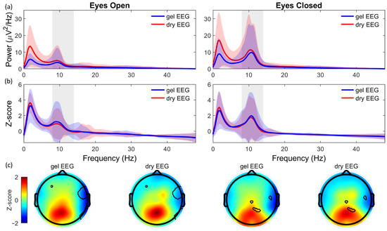 - The eyes open/eyes closed (EOEC)-task is used to compare systems in the frequency and spatial domains. The EOEC-task is frequently used in studies that validate newly developed EEG electrodes [10,11,12,13,14,18]. When closing the eyes, an increase in alpha-band activity can be observed (i.e., Berger effect [29]), which then reduces immediately when opening the eyes.